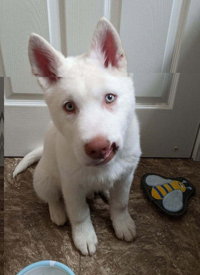 Hope 4 Huskies Rescue - Elvis - Washington StateThis young pup (4 months old) was suffering from several issues: he was missing the left cranial section of his muzzle/lip; he was coughing and congested with a nasal discharge; and he clearly had bronchial/pulmonary problems.