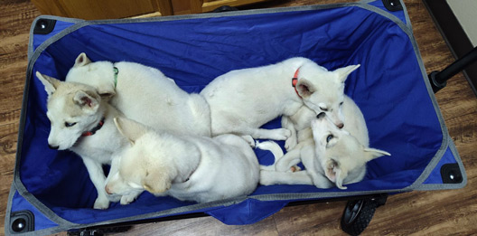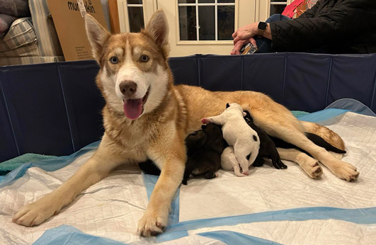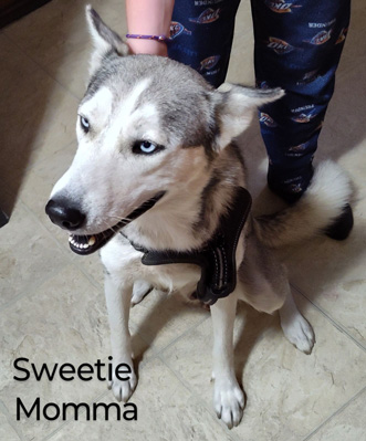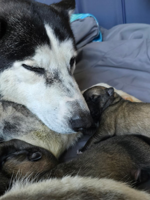 Shadow Husky Rescue, Inc. - Emmy, Penny and Moony - CaliforniaTim wrote us about Emmy, who arrived as a stray, and gave birth to five puppies two days later. Shortly after, Emmy was struggling to breathe and was rushed to the ER where she was diagnosed with a viral infection. She was treated successfully.
